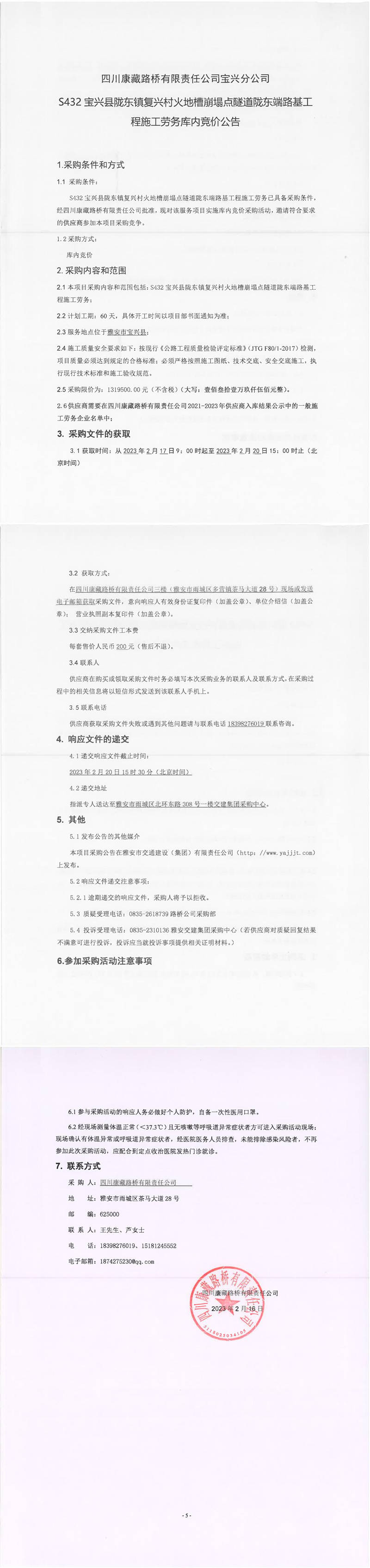四川康藏路橋有限責任公司S432寶興縣隴東鎮(zhèn)復興村火地槽崩塌點隧道隴東端路基工程施工勞務庫內競價公告