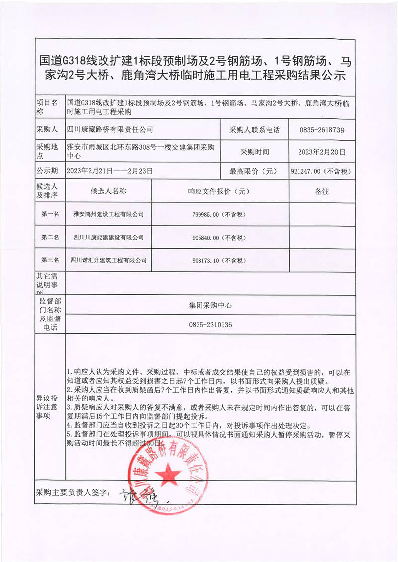 四川康藏路橋有限責任公司國道318線改擴建1標段預(yù)制場及2號鋼筋場、1號鋼筋場、馬家溝2號大橋、鹿角灣大橋臨時施工用電工程采購結(jié)果公示