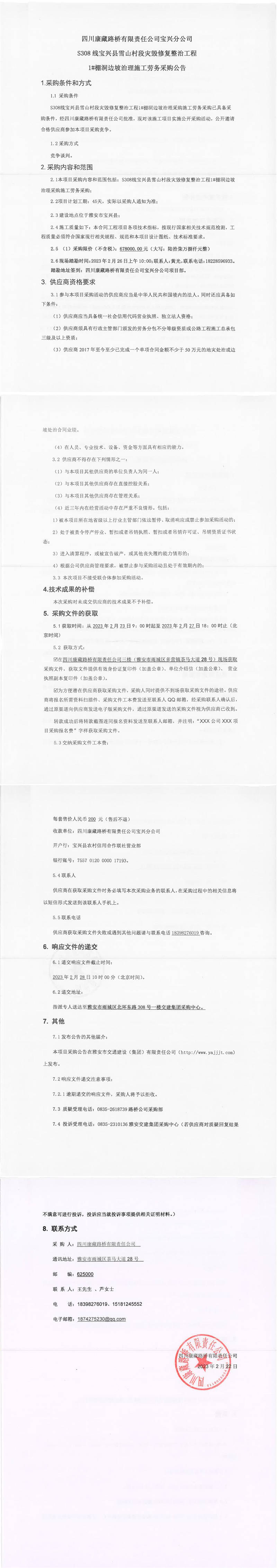 四川康藏路橋有限責(zé)任公司寶興分公司S308線寶興縣雪山村段災(zāi)毀修復(fù)整治工程1#棚洞邊坡治理施工勞務(wù)采購公告