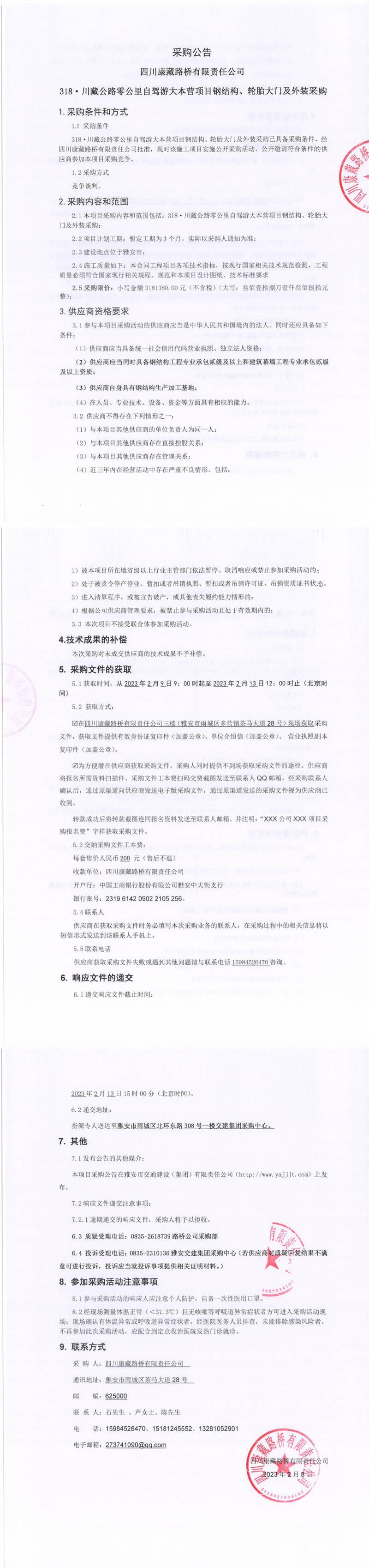 四川康藏路橋有限責任公司318.川藏公路零公里自駕游大本營項目鋼結(jié)構(gòu)、輪胎大門及外裝采購采購公告