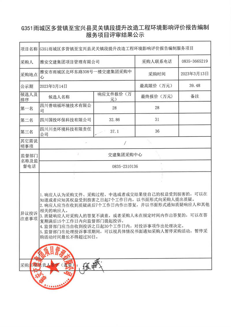 雅安交建集團項目管理有限公司G351雨城區(qū)多營鎮(zhèn)至寶興縣靈關(guān)鎮(zhèn)段提升改造工程環(huán)境影響評價報告編制服務項目結(jié)果公示