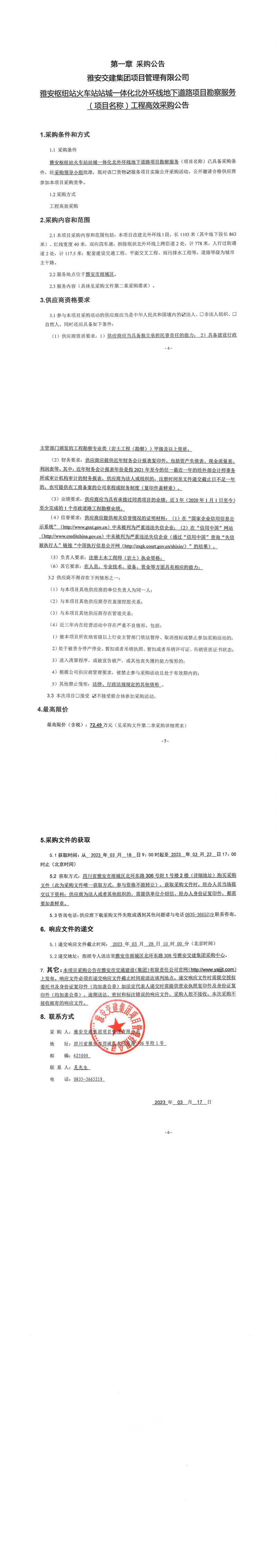雅安交建集團(tuán)項目管理有限公司雅安樞紐站火車站站城一體化北外環(huán)線地下道路項目勘察服務(wù)(項目名稱)工程高效采購公告