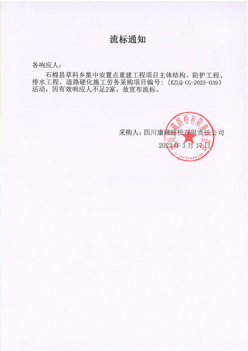 四川康藏路橋有限責任公司石棉草科鄉(xiāng)集中安置點重建工程項目主體結(jié)構、防護工程、排水工程、道路硬化施工勞務采購流標通知