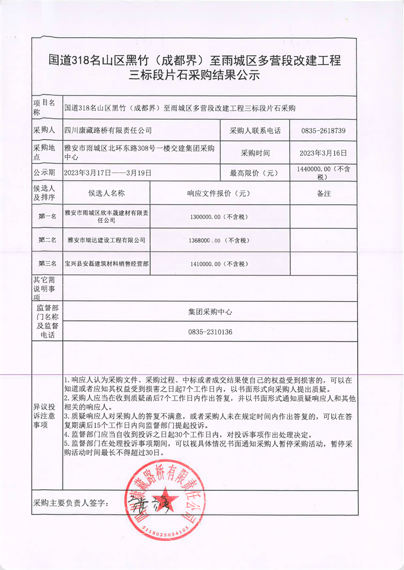 四川康藏路橋有限責(zé)任公司國(guó)道318名山區(qū)黑竹(成都界)至雨城區(qū)多營(yíng)段改建工程三標(biāo)段片石采購結(jié)果公示