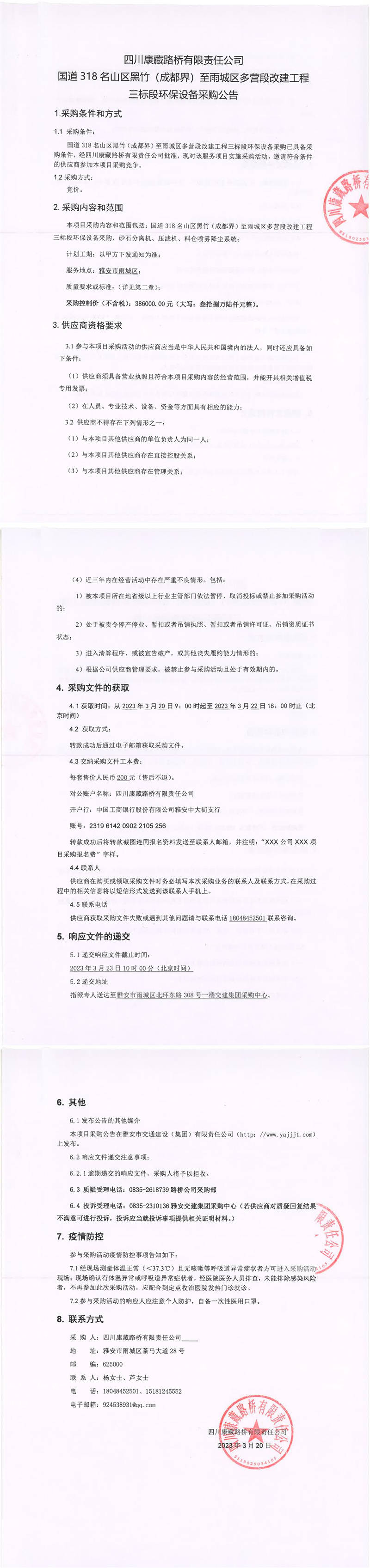 四川康藏路橋有限責任公司國道318名山區(qū)黑竹(成都界)至雨城區(qū)多營段改建工程三標段環(huán)保設(shè)備采購公告