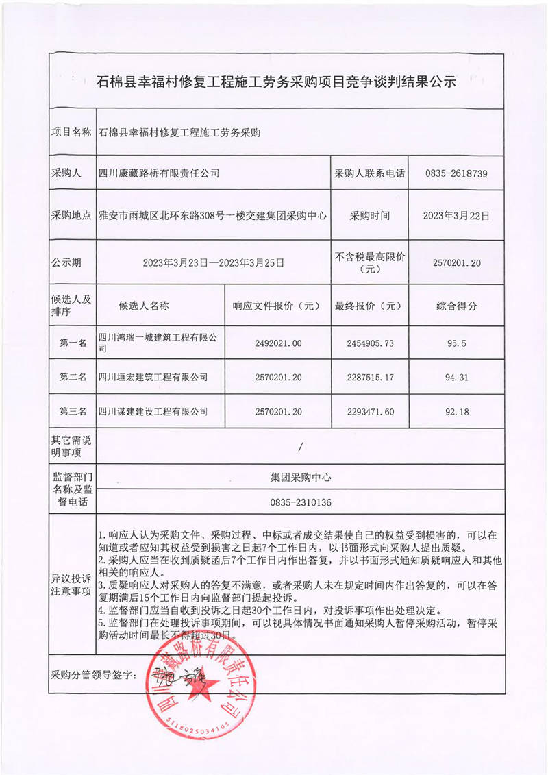 四川康藏路橋有限責(zé)任公司石棉縣幸福村修復(fù)工程施工勞務(wù)采購(gòu)項(xiàng)目競(jìng)爭(zhēng)談判結(jié)果公示