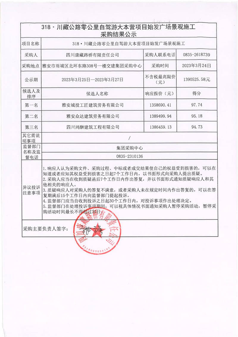 四川康藏路橋有限責(zé)任公司318·川藏公路零公里自駕游大本營(yíng)項(xiàng)目始發(fā)廣場(chǎng)景觀施工采購(gòu)結(jié)果公示