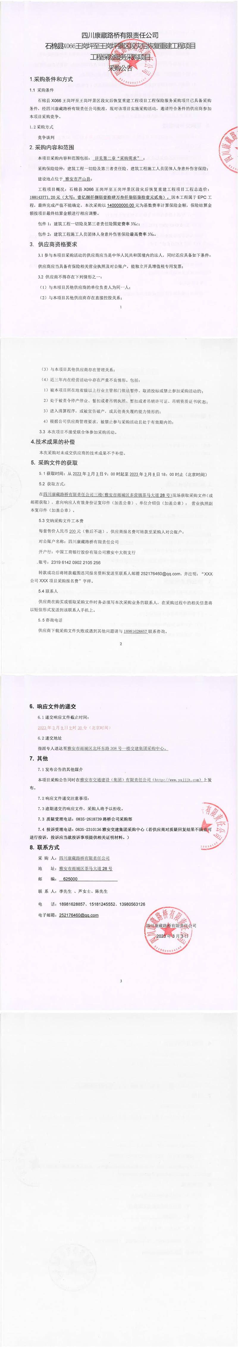 四川康藏路橋有限責任公司石棉縣X066王崗坪至王崗坪景區(qū)段災后恢復重建工程項目工程保險服務采購公告