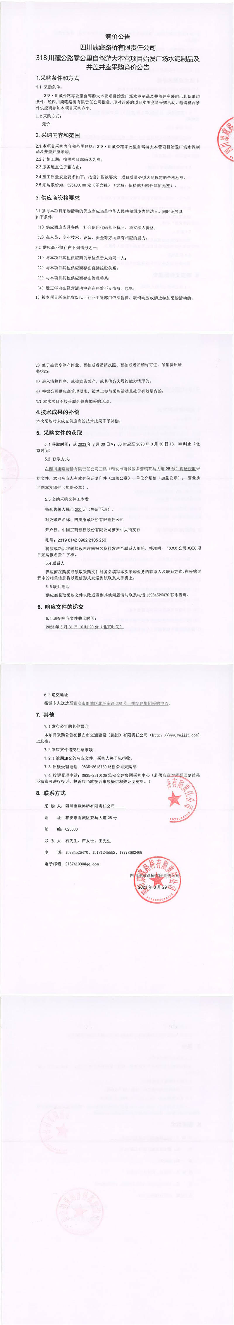 四川康藏路橋有限責(zé)任公司國道318名山區(qū)黑竹(成都界)至雨城區(qū)多營段改建工程三標(biāo)段組裝式安全梯籠采購結(jié)果公示
