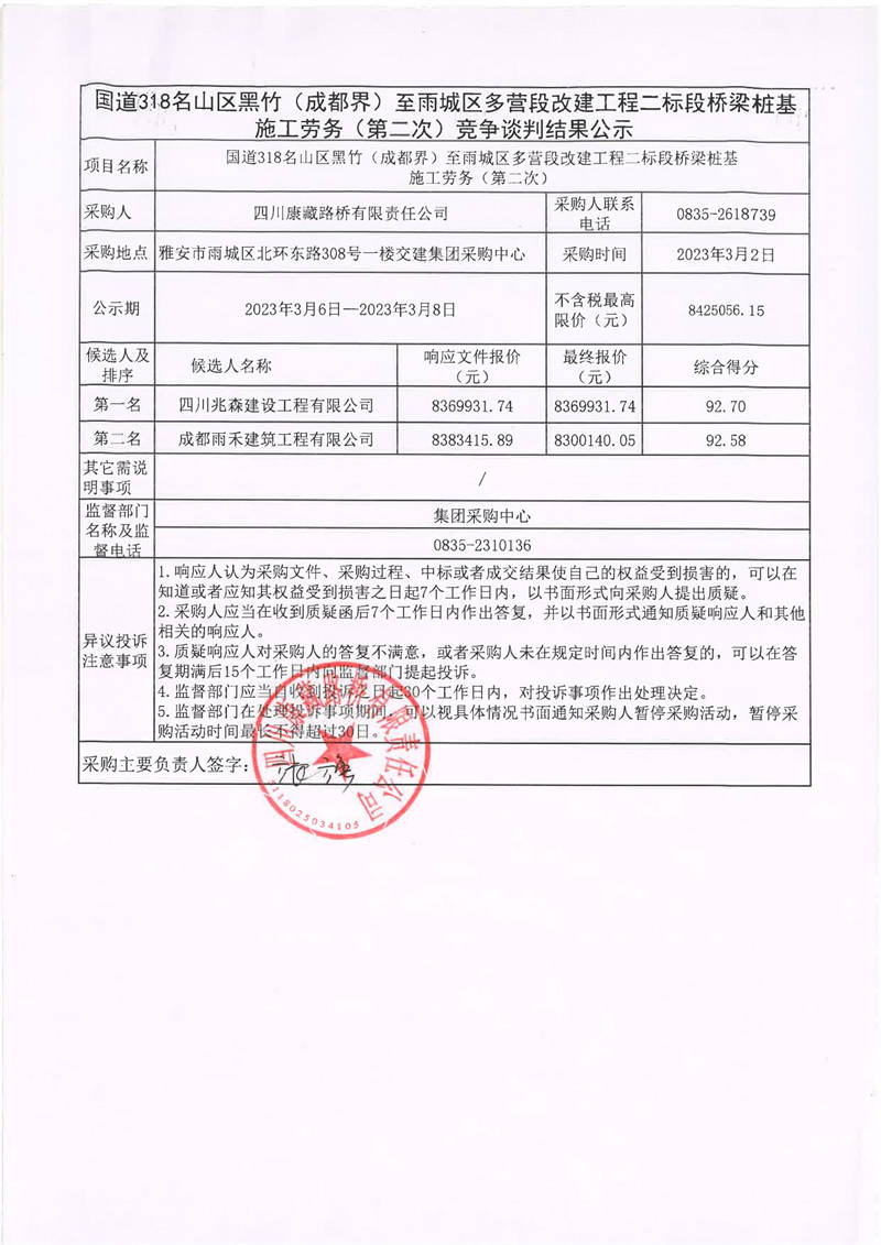 四川康藏路橋有限責(zé)任公司國(guó)道318名山區(qū)黑竹(成都界)至雨城區(qū)多營(yíng)段改建工程二標(biāo)段橋梁樁基施工勞務(wù)(第二次)競(jìng)爭(zhēng)談判結(jié)果公示