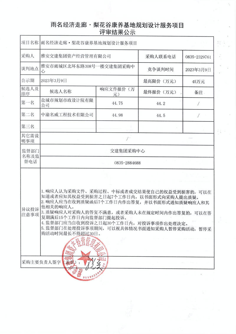 雅安交建集團(tuán)資產(chǎn)經(jīng)營管理有限公司雨名經(jīng)濟(jì)走廊·梨花谷康養(yǎng)基地規(guī)劃設(shè)計(jì)服務(wù)項(xiàng)目采購結(jié)果公示