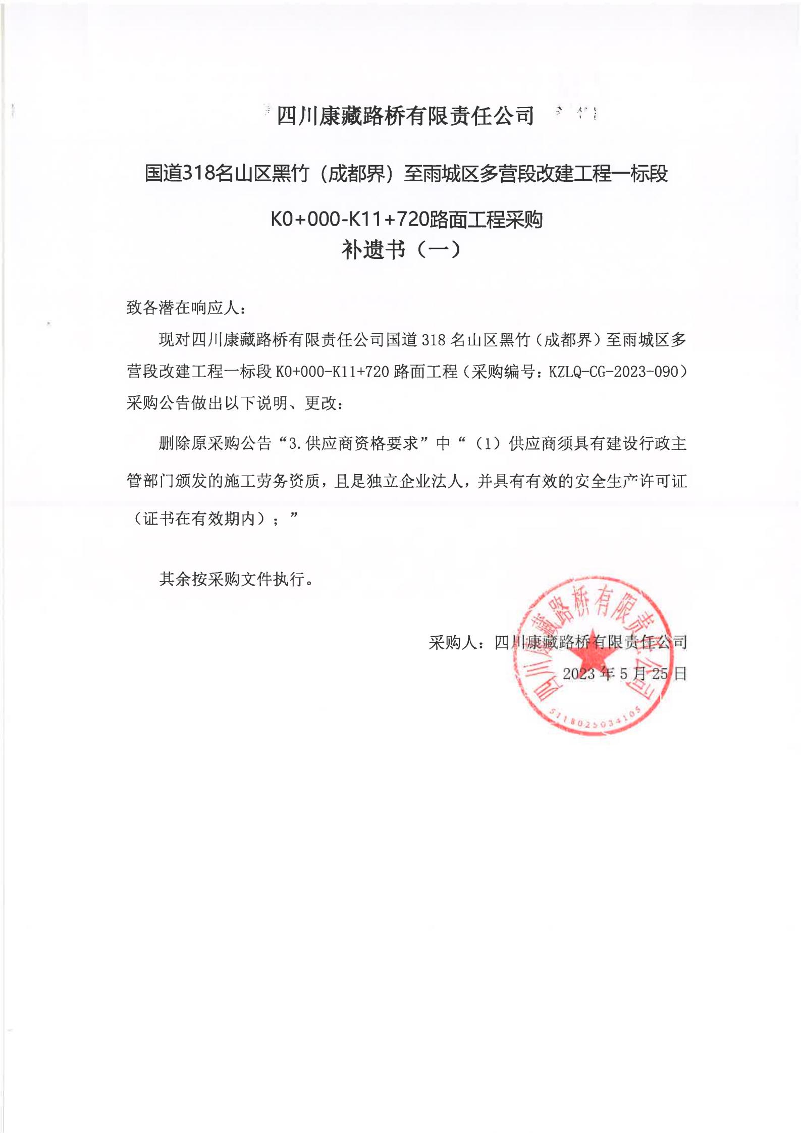 四川康藏路橋有限責(zé)任公司國(guó)道318名山區(qū)黑竹(成都界)至雨城區(qū)多營(yíng)段改建工程一標(biāo)段K0+000-K11+720路面工程采購(gòu)補(bǔ)遺書(shū)(一)