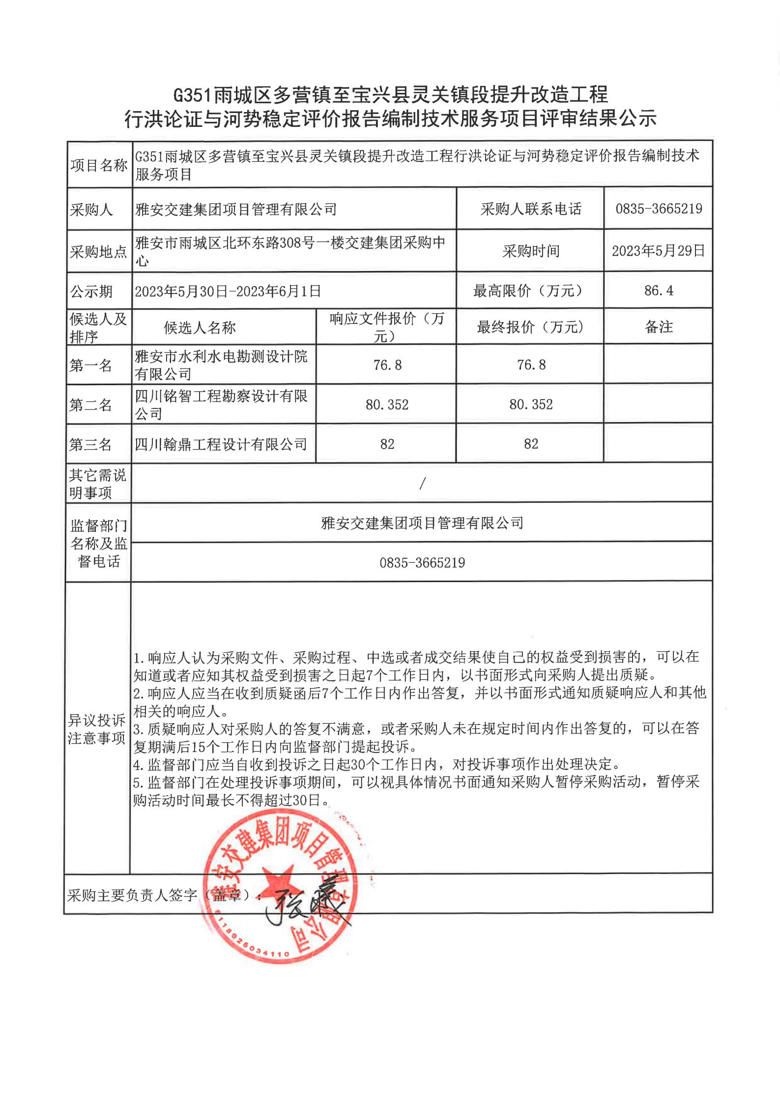 雅安交建集團(tuán)項(xiàng)目管理有限公司G351雨城區(qū)多營鎮(zhèn)至寶興縣靈關(guān)鎮(zhèn)段提升改造工程行洪論證與河勢(shì)穩(wěn)定評(píng)價(jià)報(bào)告編制技術(shù)服務(wù)項(xiàng)目評(píng)審結(jié)果公示