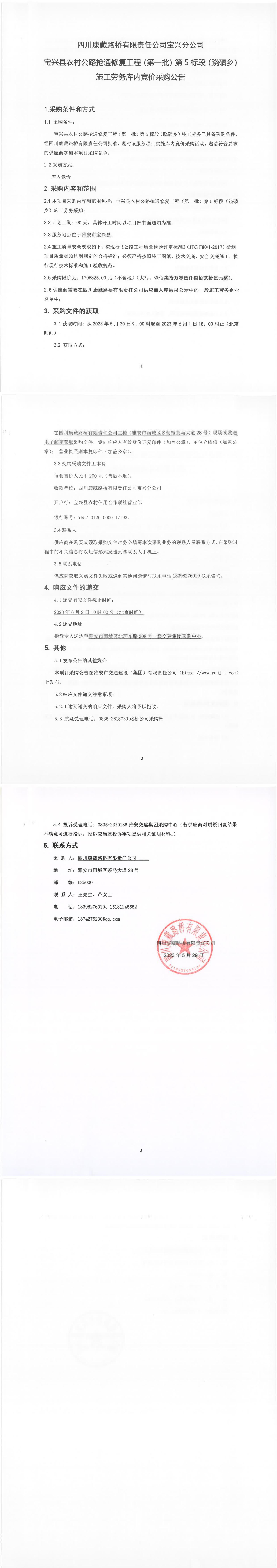 四川康藏路橋有限責任公司寶興農(nóng)村公路搶通修復工程(第一批)第5標段(蹺磧鄉(xiāng))施工勞務庫內競價采購公告