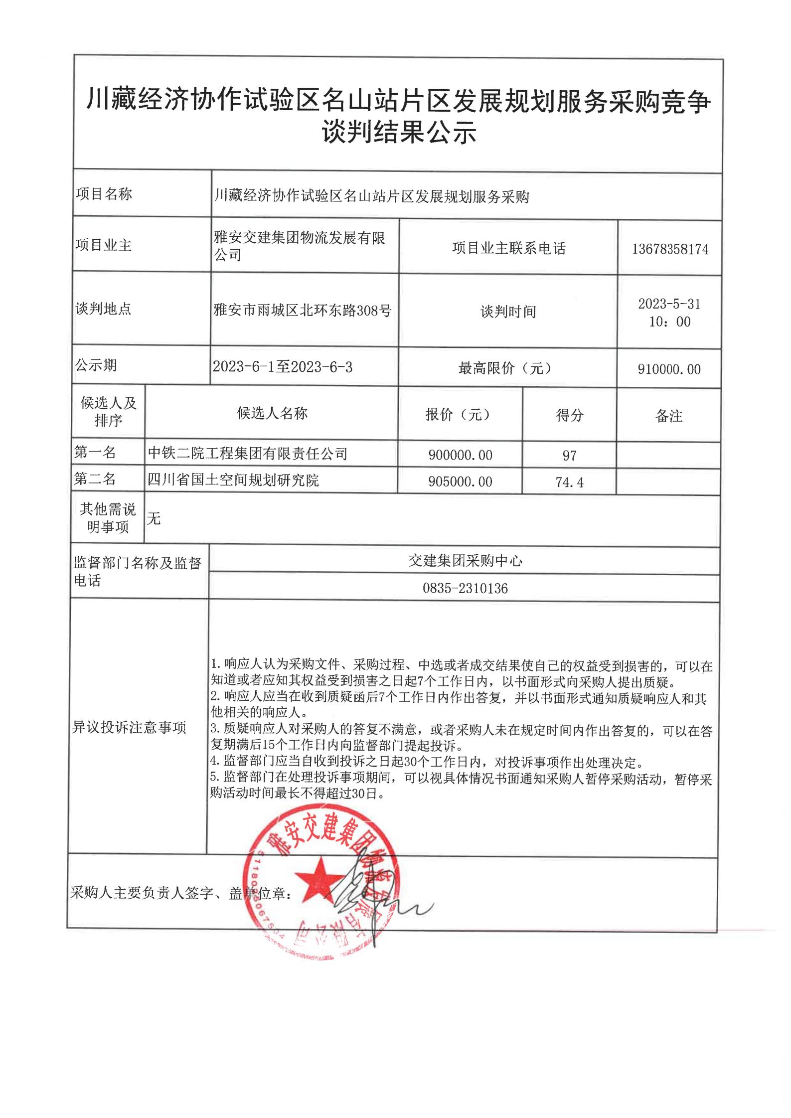 雅安交建集團(tuán)物流發(fā)展有限公司川藏經(jīng)濟(jì)協(xié)作試驗區(qū)名山站片區(qū)發(fā)展規(guī)劃編制服務(wù)采購競爭談判結(jié)果公示
