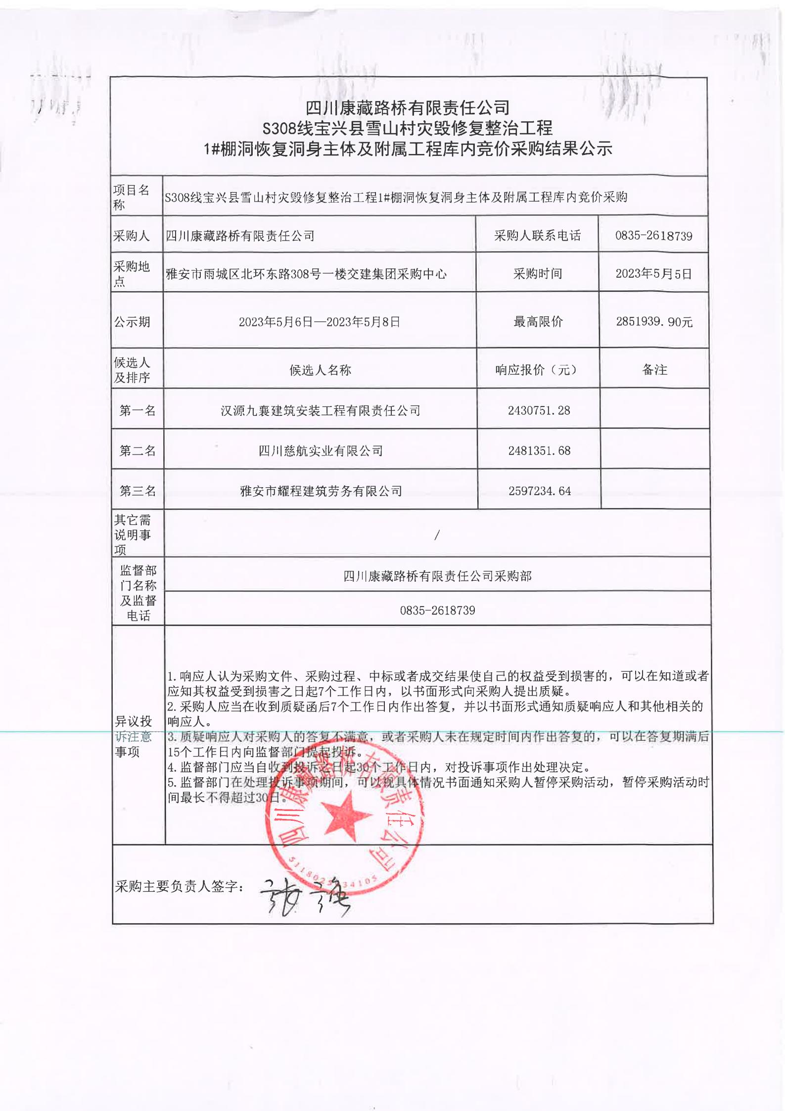 四川康藏路橋有限責任公司S308線寶興縣雪山村災毀修復整治工程1#棚洞恢復洞身主體及附屬工程庫內競價采購結果公示