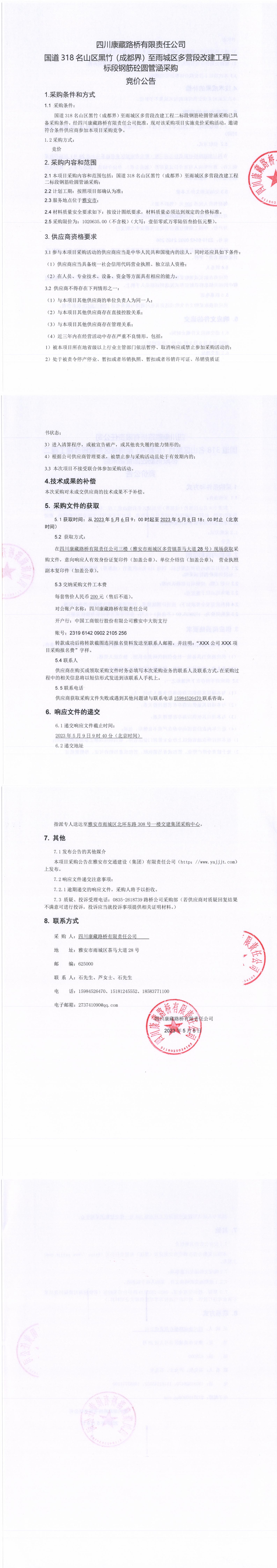 四川康藏路橋有限責(zé)任公司國道318名山區(qū)黑竹(成都界)至雨城區(qū)多營段改建工程二標(biāo)段鋼筋砼圓管涵采購競價(jià)公告