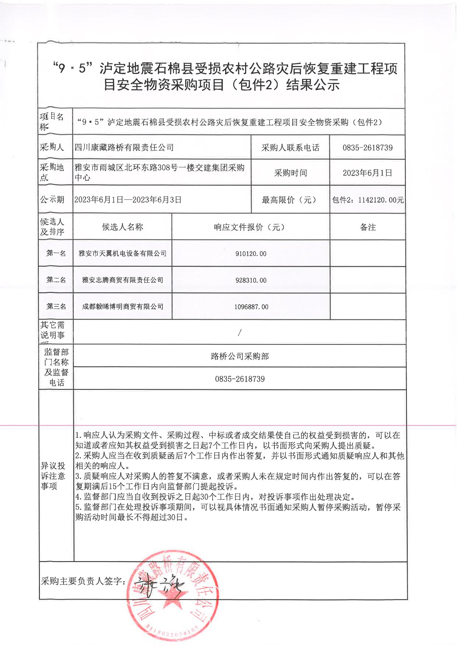 四川康藏路橋有限責任公司“9·5”瀘定地震石棉縣受損農(nóng)村公路災后恢復重建工程項目安全物資項目(包件2)結(jié)果公示