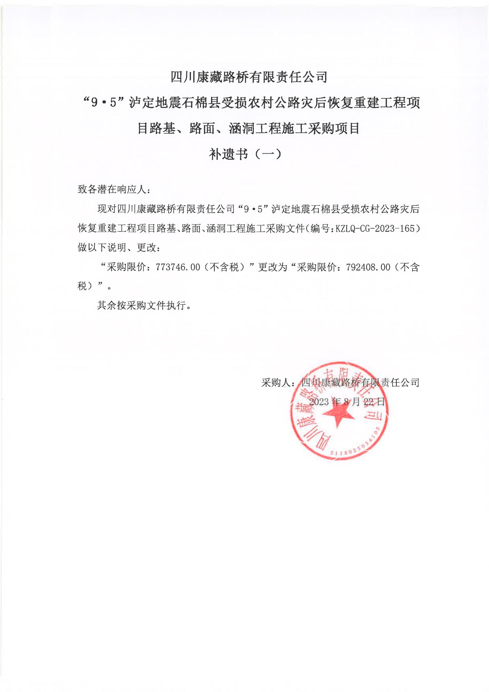 四川康藏路橋有限責任公司“9·5”瀘定地震石棉縣受損農村公路災后恢復重建工程項目路基、路面、涵洞工程施工采購項目補遺書(一)