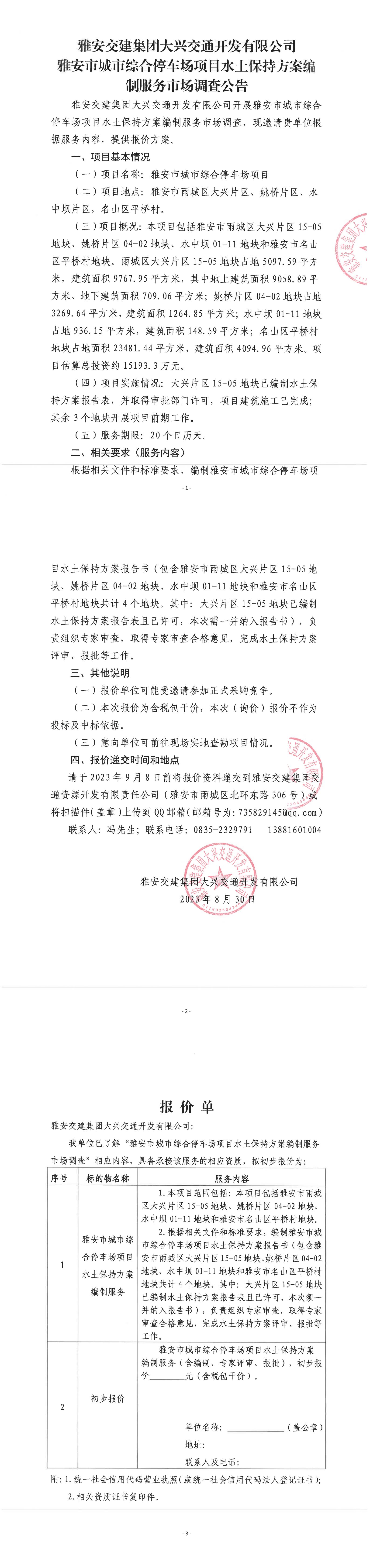 雅安交建集團(tuán)大興交通開發(fā)有限公司雅安市城市綜合停車場項(xiàng)目水土保持方案編制服務(wù)市場調(diào)查公告
