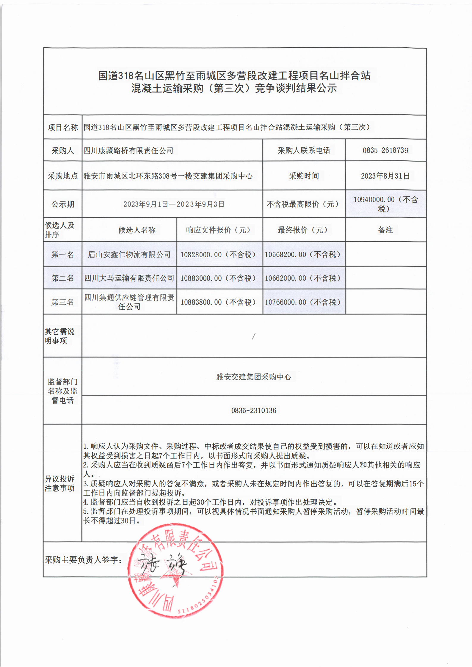 四川康藏路橋有限責(zé)任公司國(guó)道318名山區(qū)黑竹至至雨城區(qū)多營(yíng)段改建工程項(xiàng)目名山拌合站混凝土運(yùn)輸采購(第三次)競(jìng)爭(zhēng)談判結(jié)果公示