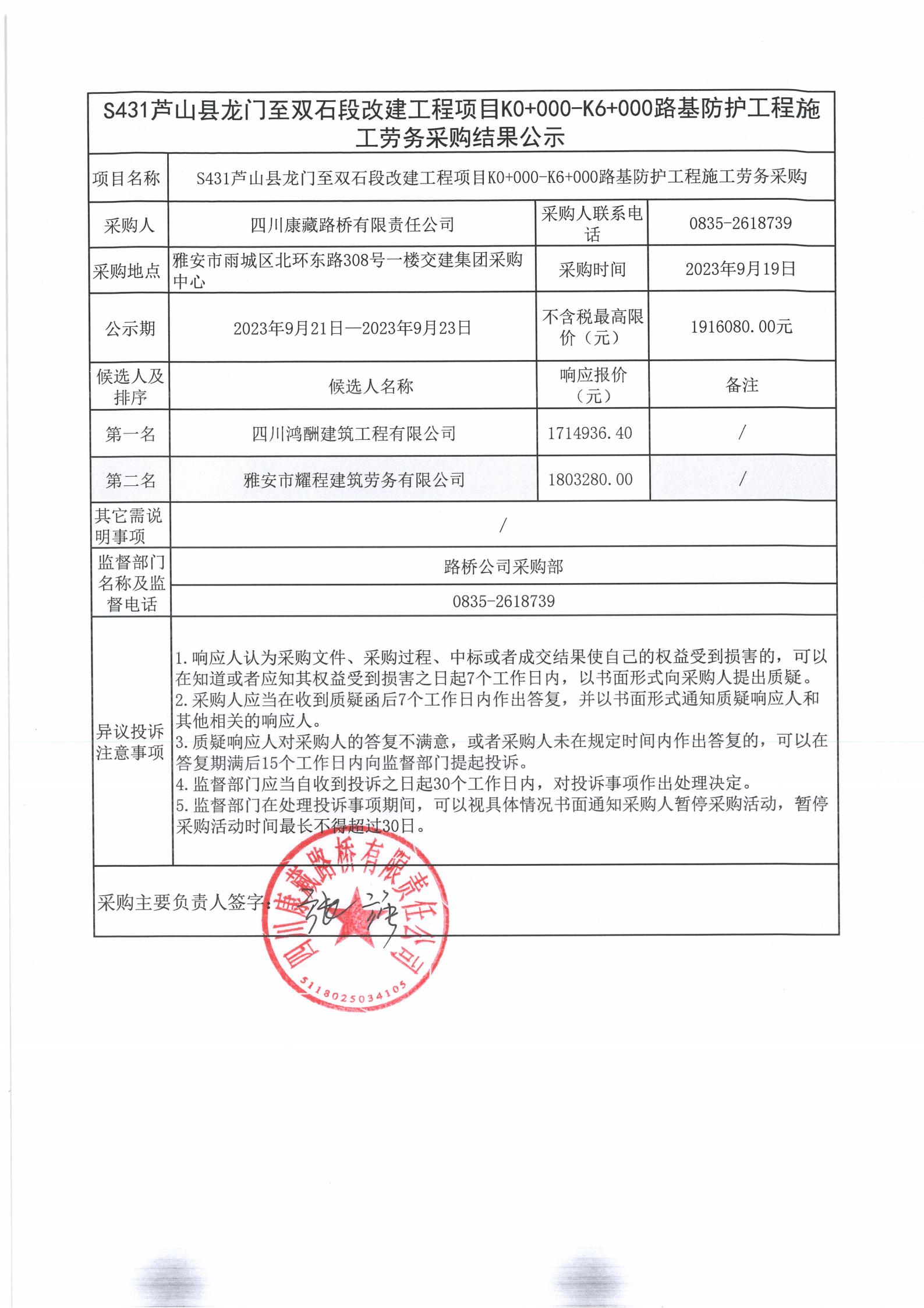 四川康藏路橋有限責任公司S431蘆山縣龍門至雙石段改建工程項目K0+000-K6+000路基防護工程施工勞務(wù)采購結(jié)果公示