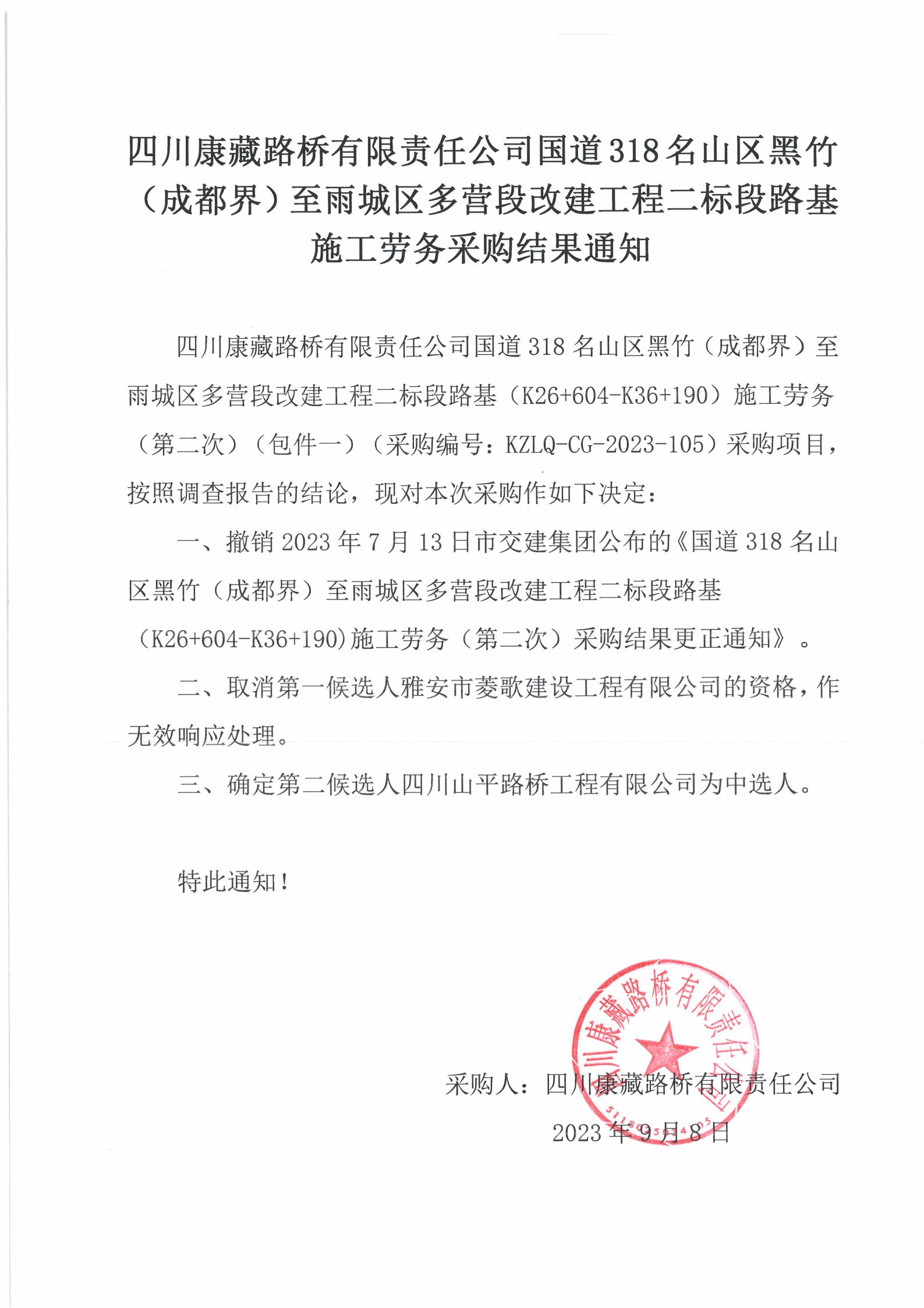 四川康藏路橋有限責任公司國道318名山區(qū)黑竹(成都界)至雨城區(qū)多營段改建工程二標段路基施工勞務(wù)采購結(jié)果通知