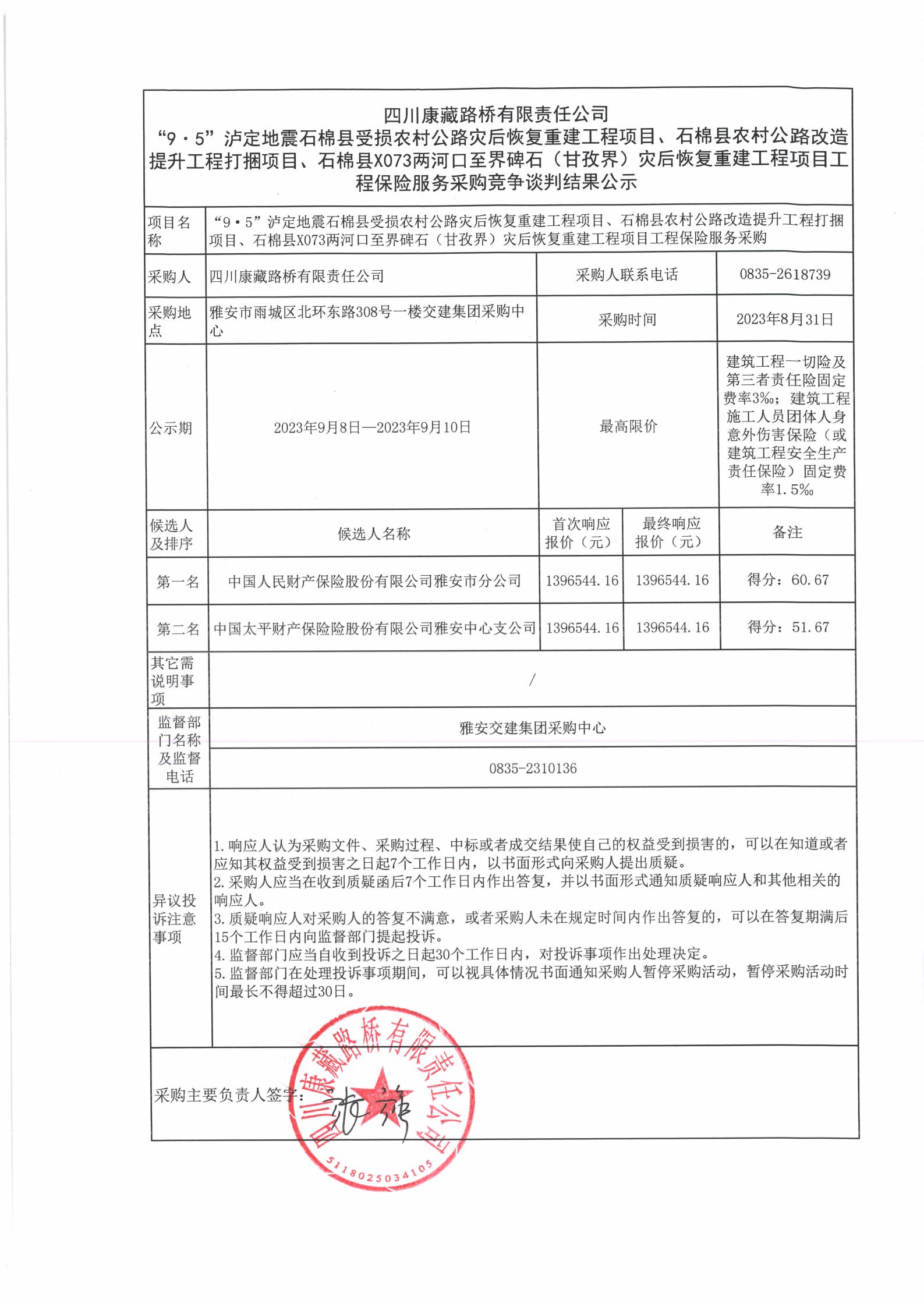 四川康藏路橋有限責任公司“9·5”瀘定地震石棉縣農(nóng)村公路災后恢復重建工程項目、石棉縣農(nóng)村公路改造提升工程打捆項目、石棉縣X073兩河口至界碑石(甘孜界)災后恢復重建工程項目工程保險服務采購競爭談判結(jié)果公示
