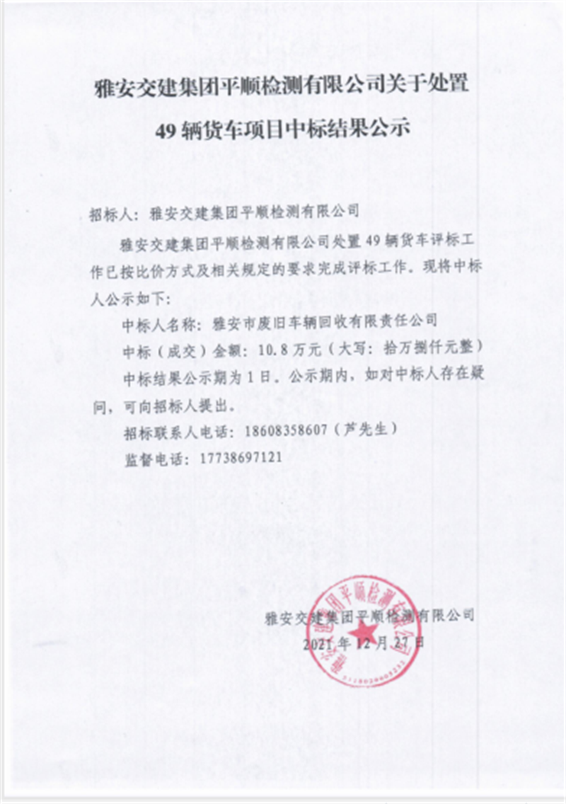 雅安交建集團平順檢測公司關于處置49輛貨車項目中標結(jié)果公示