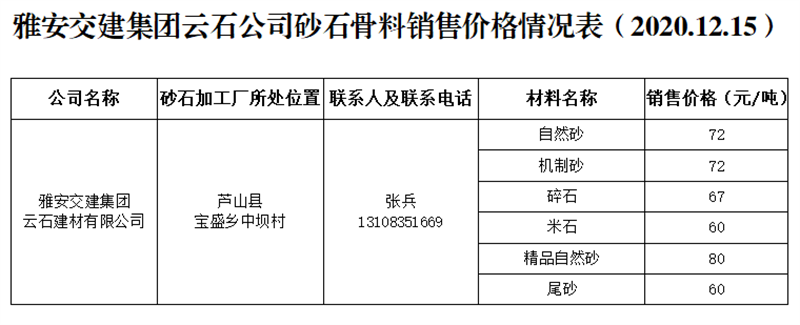 雅安交建集團(tuán)云石公司砂石骨料銷(xiāo)售價(jià)格情況表(2020.12.15)
